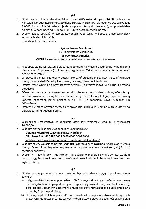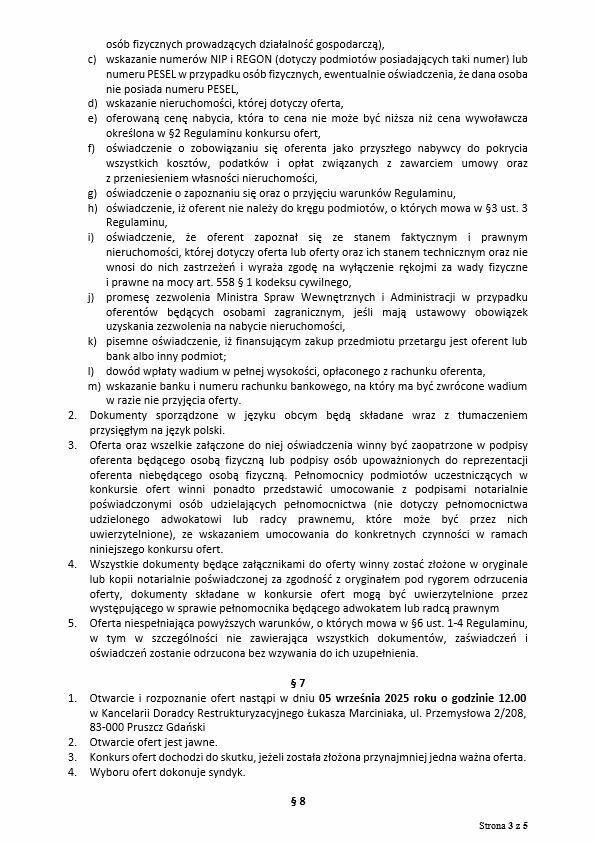 2 Oferty należy składać do dnia 04 września 2025 roku, do godz. 14.00 osobiście w Kancelarii Doradcy Restrukturyzacyjnego Łukasza Marciniaka, ul. Przemysłowa 2 lok. 208,