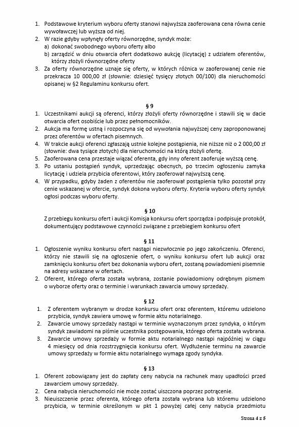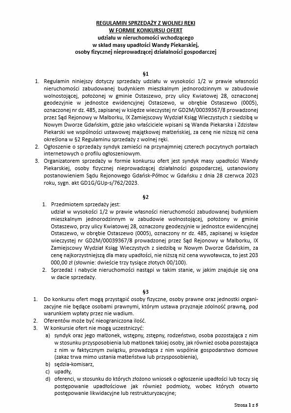 WYCIĄG Z REGULAMINU SPRZEDAŻY.1. Przedmiotem sprzedaży jest udział w wysokości 1/2 w prawie własności nieruchomości zabudowanej budynkiem mieszkalnym jednorodzinnym w zabudowie wolnostojącej, położony w gminie Ostaszewo, przy ulicy Kwiatowej 28, oznaczony geodezyjnie w jednostce ewidencyjnej Ostaszewo, w obrębie Ostaszewo (0005), oznaczony nr dz. 485, zapisanej w księdze wieczystej nr GD2M/00039367/8 prowadzonej przez Sąd Rejonowy w Malborku, IX Zamiejscowy Wydział Ksiąg Wieczystych z siedzibą w Nowym Dworze Gdańskim, za cenę najkorzystniejszą dla masy upadłości, nie niższą niż cena wywoławcza, to jest 203 000,00 zł (słownie: dwieście trzy tysiące złotych 00/100).