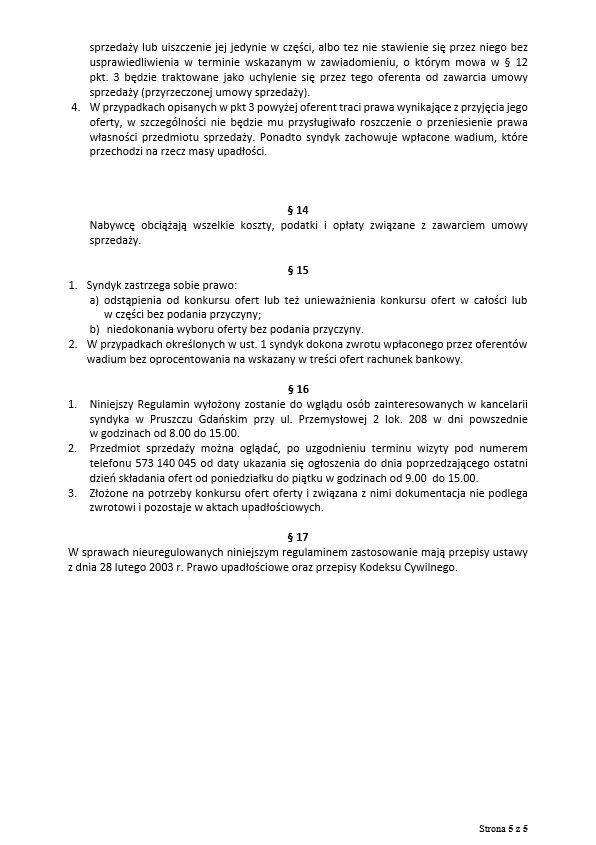 5. Przedmiot sprzedaży można oglądać, po uzgodnieniu terminu wizyty pod numerem telefonu 573 - pokaż numer telefonu - od daty ukazania się ogłoszenia do dnia poprzedzającego ostatni dzień składania ofert od poniedziałku do piątku w godzinach od 9.00 do 15.00.